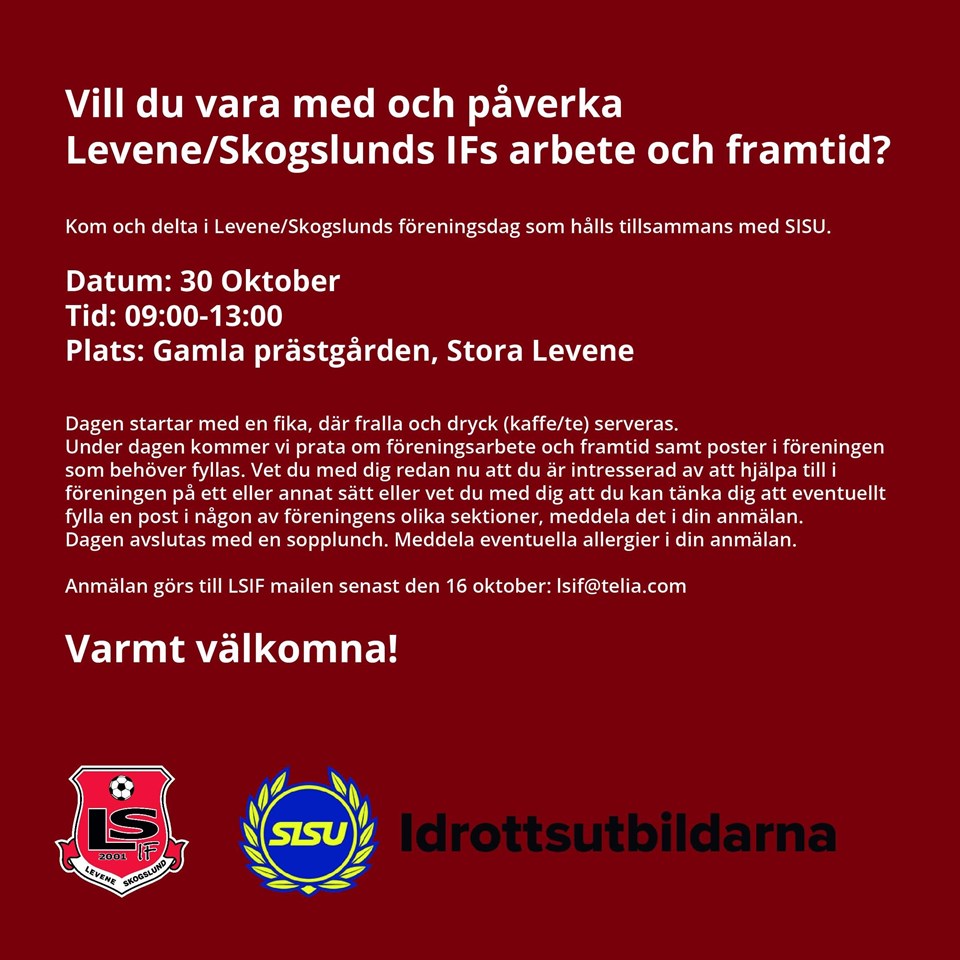 Vill du vara med och påverka Levene/Skogslunds IFs arbete och framtid? Kom och delta i Levene/Skogslunds föreningsdag som hålls tillsammans med SISU. Levene/Skogslunds IF 4 okt 2022 0kommentarer